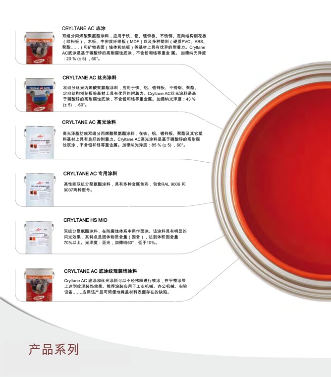 双组分丙烯酸聚氨酯涂料,应用于铁、铝、镀锌板、不锈钢、定向结构刨花板(欧松板)、木板、中密度纤维板(MDF)以及多种塑料(硬质PVC、ABS、聚酯……)和矿物表面(墙体和地板)等基材上具有优异的附着力。Cryltane AC底涂是基于磷酸锌的高耐腐蚀底涂,不含铅和铬等重金属。加德纳光泽度:20 % (± 5) ,60°。