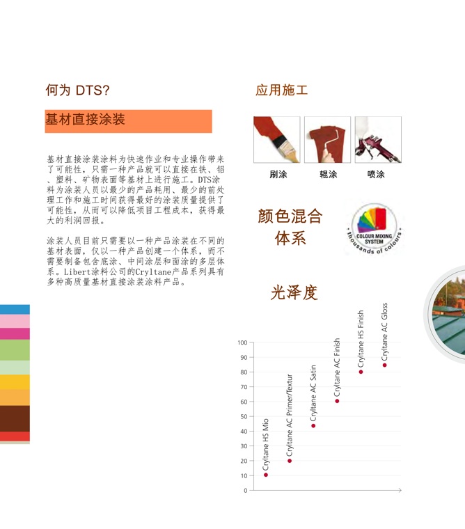 基材直接涂装涂料为快速作业和专业操作带来了可能性,只需一种产品就可以直接在铁、铝、塑料、矿物表面等基材上进行施工。DTS涂料为涂装人员以最少的产品耗用、最少的前处理工作和施工时间获得最好的涂装质量提供了可能性,从而可以降低项目工程成本,获得最大的利润回报。