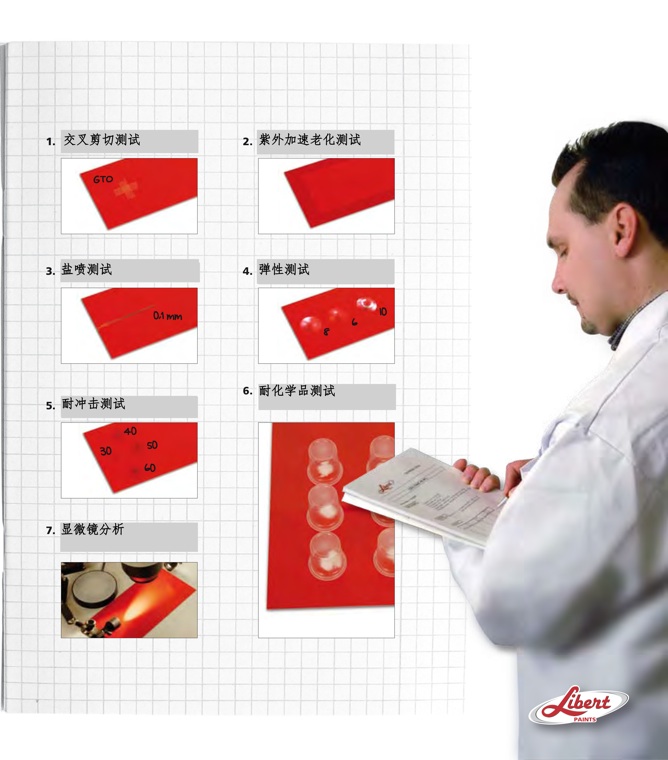 在测试周期内,将浸泡了化学物质的棉花放置于涂层样板上,测试的化学物质包括酸、碱、溶剂、油脂或者顾客所要求的其它化学产品。